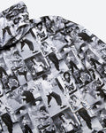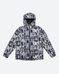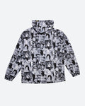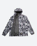 100% Poly Windbreaker / Full Zip Hood Style / Water Resistant Coated Fabric / All Over Pattern Art / Body Lining / Adjustable Hood and Hem / YKK Front Zipper / Lower Front Pockets / Elastic Cuffs / Adjustable Toggle Cord Hem
