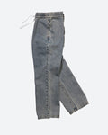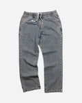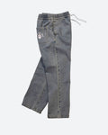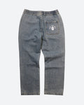 100% Cotton 12ounce Denim / Loose Fit Pant / Aged Stone Heavy Wash / Embroidery on Back Pocket / Elastic Waistband w/ Drawcord / Hidden Cuff Closure