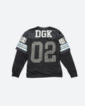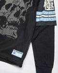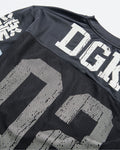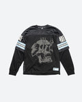 100% Poly Football Jersey Over Long Sleeve Knit / Boxy Fit / Vintage Print Art Front, Back and Sleeves / Mesh Lower Body / Characters read "Paradise"