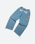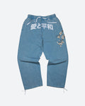 80% Cotton 20% Poly Fleece / Lounge Style Pant / 380gsm Heavy Weight Fleece / Custom Wash / Leg Embroidery Art / Front Body Embroidery Art / Side Seam Hand Pockets / Back Pocket / Elastic Waistband with Drawcord / Leg Opening Adjusters / Characters read "Love and Peace - Life"